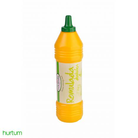 Składniki: olej rzepakowy, woda, kapusta kwaszona 7,5%, ocet spirytusowy, ogórki konserwowe 2,6% (ogórki, woda, ocet spirytusowy, cukier, sól), cukier, żółtko jaja w proszku, sól, gorczyca, cebula marynowana 0,8% (cebula, woda, ocet, cukier, sól, przeciwutleniacze: kwas cytrynowy, kwas askorbinowy, pirosiarczyn sodu), skrobia modyfikowana, przyprawy (zawiera soję), substancje konserwujące (benzoesan sodu, sorbinian potasu), stabilizator (guma ksantanowa), regulator kwasowości (kwas cytrynowy), barwnik kurkumina, substancja słodząca (sacharyny).