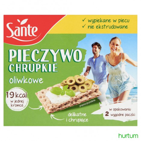 1 kromka Pieczywa chrupkiego oliwkowego Sante zawiera tylko 19 kcal, czyli aż 3 razy mniej niż 1 kromka zwykłego chleba pszennego..