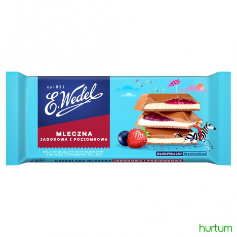 Czekolada mleczna z nadzieniem jagodowym i poziomkowym.