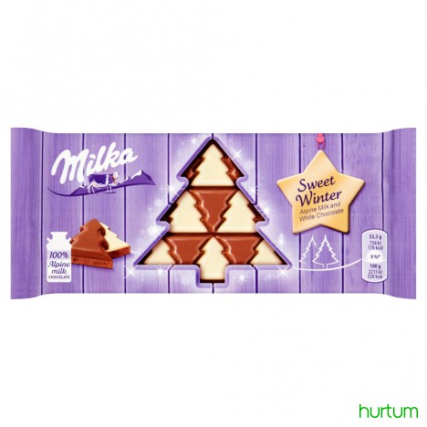 Czekolada mleczna z mleka alpejskiego (88%) z białą czekoladą (12%).