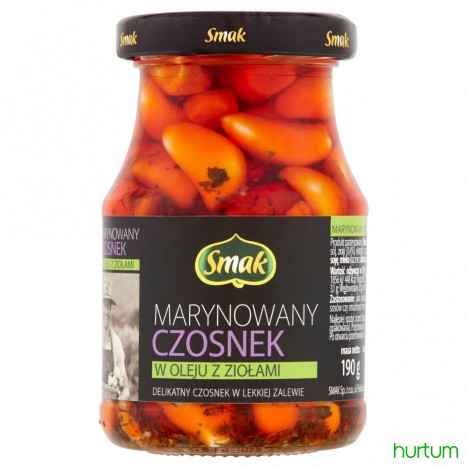 Marynowany czosnek w oleju z ziołami. Produkt pasteryzowany.