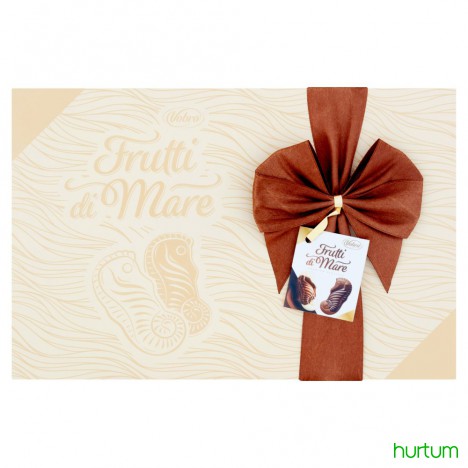 | Frutti di Mare - Praliny z białej czekolady (34%) i czekolady (9%) nadziewane kremem (57%) o smaku karmelowym, orzechowym, mlecznym i kakaowym |