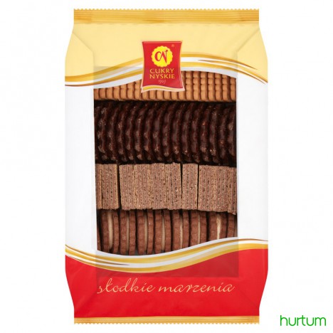 Skład: herbatniki deserowe z cukrem, herbatniki kruche, wafle kakaowe, markizy orzechowe, herbatniki w polewie kakaowej.