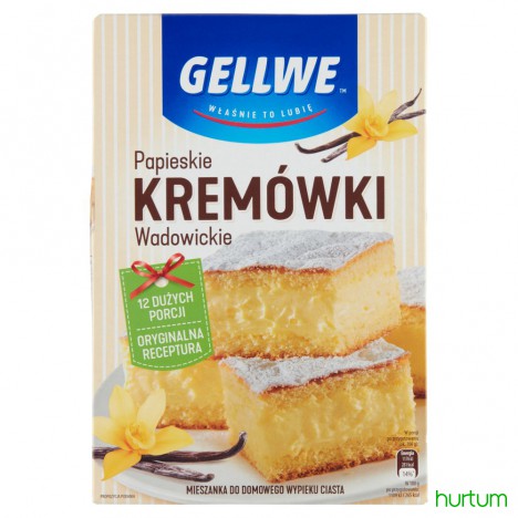 Upieczone i wystudzone ciasto przekroić poziomo na 2 równe części. Obydwie połowy ciasta nasączyć według uznania zimnym ponczem przygotowanym ze 125 ml przegotowanej wody, łyżeczki cukru i soku wyciśniętego z ćwiartki cytryny. Rozsmarować na jednej części wcześniej przygotowany krem i przykryć drugą częścią ciasta. Gotową kremówkę można posypać cukrem pudrem Gellwe. Tak przygotowane ciasto schłodzić w lodówce.