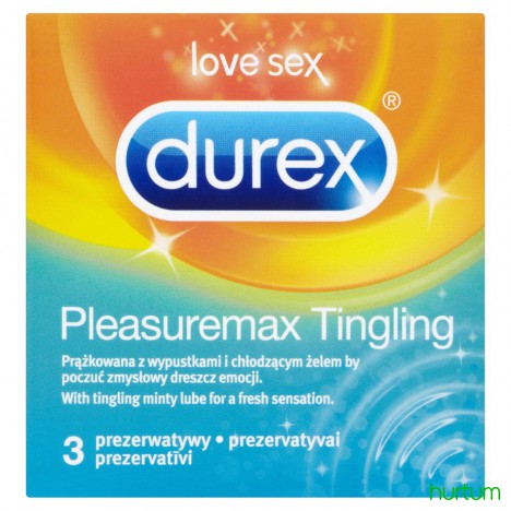 Poczuj dreszczyk emocji! Durex Pleasuremax Tingling to 3 prążkowane prezerwatywy z wypustkami pokryte specjalnym żelem, który uwalnia dreszczyk emocji i dostarcza dodatkowych, intensywnych doznań. Przezroczyste, wykonane z naturalnej gumy lateksowej, o kształcie easy-on, zakończone zbiorniczkiem.