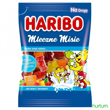 Żelki owocowe z odtłuszczonym mlekiem (6%) oraz dodatkiem soku owocowego z zagęszczonego soku owocowego (20% w kolorowej części żelka).
