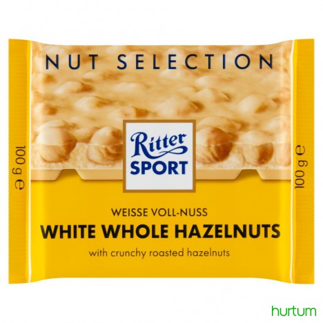Biała czekolada z całymi prażonymi orzechami laskowymi (25%) i chrupkami (3%) ryżowymi.