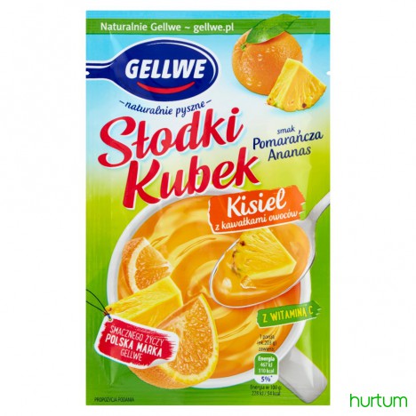 Kisiel w proszku o smaku pomarańczowo-ananasowym z kawałkami owoców i witaminą C.