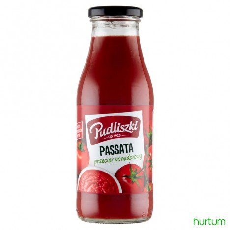 Nazwa „Passata” pochodzi od włoskiego passate i oznacza tyle co przechodzić przez. To dlatego, że passata to pomidory, które przechodzą przez ostrza i tarki, by uzyskać płynną konsystencję. Nasza passata to przetarte, pozbawione skórki i pestek pomidory, z których odparowaliśmy nieco wody, tak aby uzyskać gęstą, ale jeszcze płynną (w porównaniu do koncentratu pomidorowego) konsystencję. Gotową passatę zamknęliśmy w przyjaznej środowisku szklanej butelce, dzięki czemu od razu można zobaczyć jak gęsta i intensywnie czerwona jest zawartość.