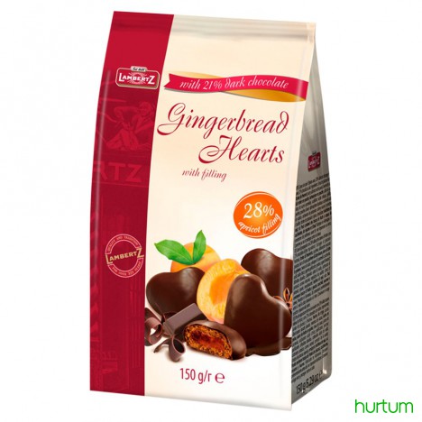 Pierniki w kształcie serc w czekoladzie (21%) z nadzieniem morelowym (28%).