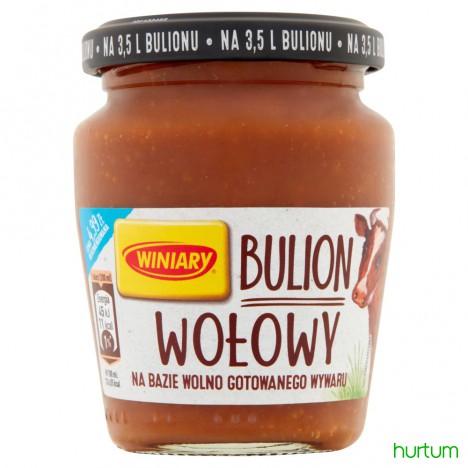 Pasteryzowany Bulion wołowy Winiary to esencjonalny bulion o unikalnej półpłynnej konsystencji, który doskonale podkreśli smak Twoich potraw. Wykorzystać go możesz jako bazę do zup i sosów lub jako sposób na pogłębienie smaku różnorodnych dań.
