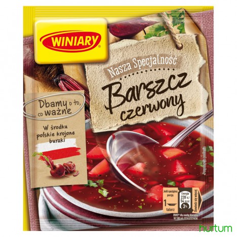 Nasz barszcz czerwony Winiary kryje w sobie kawałki buraków, których smak podkreśla czosnek i majeranek. Wszystkie te składniki doskonale znasz ze swojej kuchni.