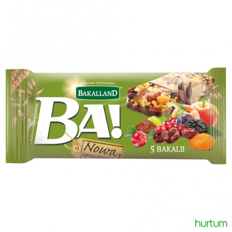Baton zbożowy BA! 5 bakalii to kompozycja najwyższej jakości soczystych bakalii: moreli, śliwki, rodzynek, żurawiny i jabłka, połączonych z polskimi zbożami. Baton BA! 5 bakalii to również źródło potasu, wspierającego funkcjonowanie układu nerwowego. Teraz Nowa lepsza receptura batonów Ba!