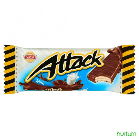 Wafle przekładane kremem o smaku mlecznym (58%) w mleczno-kakaowej polewie.