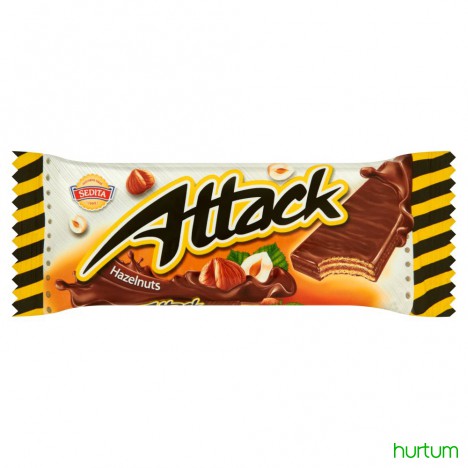 Wafle przekładane kremem o smaku orzechów laskowych (58%) w mleczno-kakaowej polewie.
