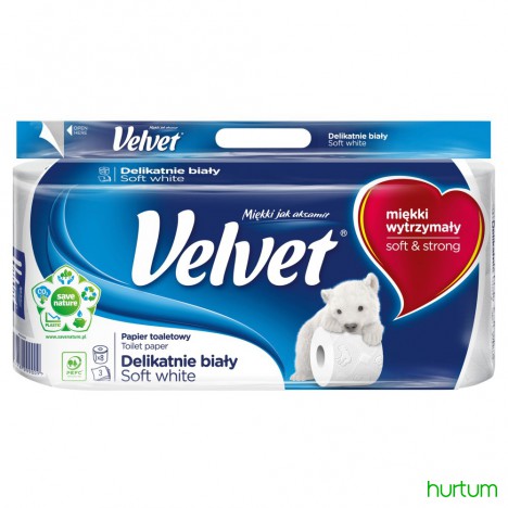 Papier toaletowy Velvet Delikatnie Biały to trzy warstwy miękkiej bibułki połączonej delikatnym, tłoczonym wzorem z postaciami niedźwiadków. Każdy listek to optymalne połączenie wytrzymałości i aksamitnej miękkości papieru Velvet.