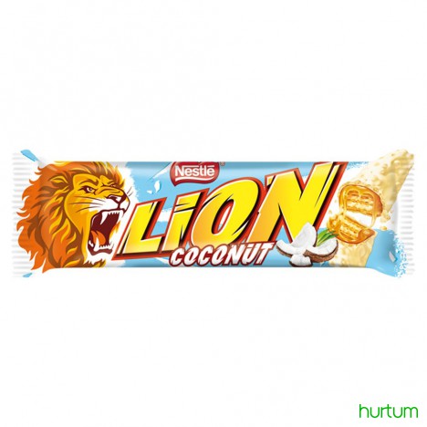 Nadziewany wafel z karmelem (30,3%), płatkami pszennymi (8,8%) i wiórkami kokosowymi (1,6%) w białej polewie.
