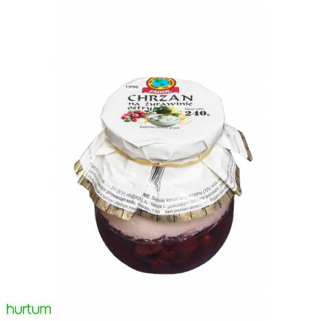 Składniki: tarty korzeń chrzanu (55%), żurawina (40%), woda, cukier, ocet jabłkowy, sól, sok z cytryny, olej rzepakowy