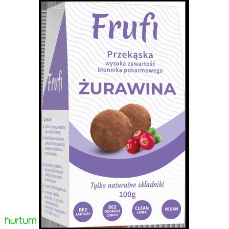 Przekąski firmy Frufi to prosty skład i tylko naturalne składniki. Przekąska w kształcie kulek, składniki mielone co poprawia komfort konsumpcji. Przygotowywane z wyselekcjonowanych składników, zapewnia zdrową alternatywę dla tradycyjnych słodyczy. Odznaczają się świeżym, żurawinowym smakiem zamkniętym w polewie ze 100% miazgi kakaowej. Przekąski zawierają m.in: Otręby owsiane- produkt uboczny otrzymywany podczas produkcji mąk i kasz. Kiedyś uznawane za odpad, dziś doceniane za wysoką zawartość błonnika, witamin i składników mineralnych. Żurawina- zawiera antyoksydanty opóźniające proces starzenia, a także witaminy A, C oraz B. Od lat stosowana jest jako substancja wspomagająca leczenie infekcji dróg moczowych. NIE zawierają dodatków do żywności wymienionych w Rozporządzenie Komisji (UE) nr 1333/2008 z późn. zm. substancji słodzących barwników konserwantów przeciwutleniaczy i regulatorów kwasowości emulgatorów, środków zagęszczających, spulchniających, żelujących itp. substancji przeciwzbrylających wzmacniaczy smaku środków słodzących, nabłyszczających i innych stabilizatorów, konserwantów, zagęstników i innych NIE stosujemy obróbki termicznej a składniki są tylko mikronizowane, co pozwala na zachowanie właściwości odżywczych i pełni smaku każdego składnika. Drobne cząstki składników łatwiej przyswajane są przez układ pokarmowy i dają komfort konsumpcji. Produkt może zawierać śladowe ilości migdałów, orzechów arachidowych, kakao