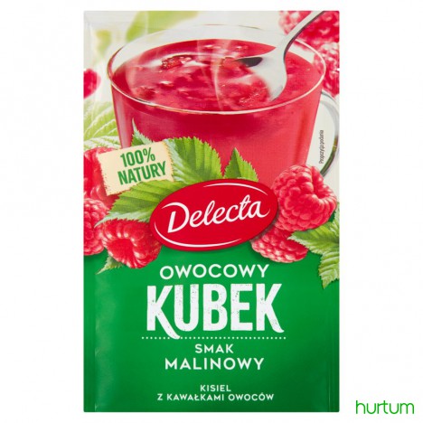Kisiel o smaku malinowym w proszku z kawałkami owoców.