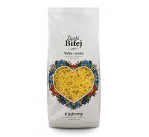 Tradycja wyrabiania własnego makaronu jest obecna w naszych domach od dzieciństwa. Babcia wyrabiała ciasto na makaron łącząc mąkę, jaja i wodę. Ciasto później wałkowała w duże płaty które suszyła na czystych prześcieradłach na łóżku. Gdy płaty nieco już się podsuszyły, babcia kroiła je w pasy nożem i wkładała do maszynki na makaron, a wnuki pomagały kręcić korbką. Tak właśnie powstawał w domu naszej babci makaron do rosołu. To wspomnienie zainspirowało nas do stworzenia makaronu, który pozwoliłby poczuć smak tej tradycji na Państwa stołach. Tak narodził się Śląski Bifej.